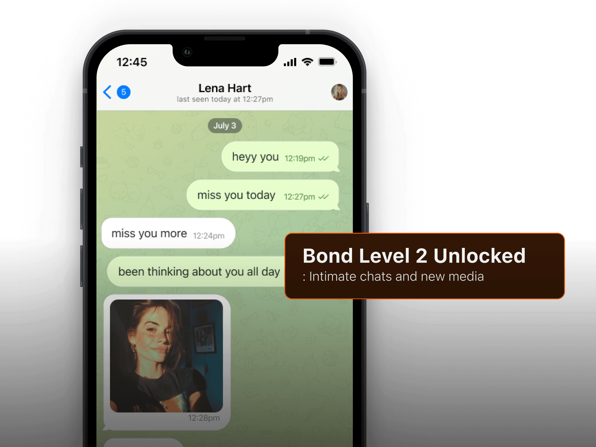 As bond rises, the bot gets bolder and unlocks gated images/videos—auto-managed from the media you submit.