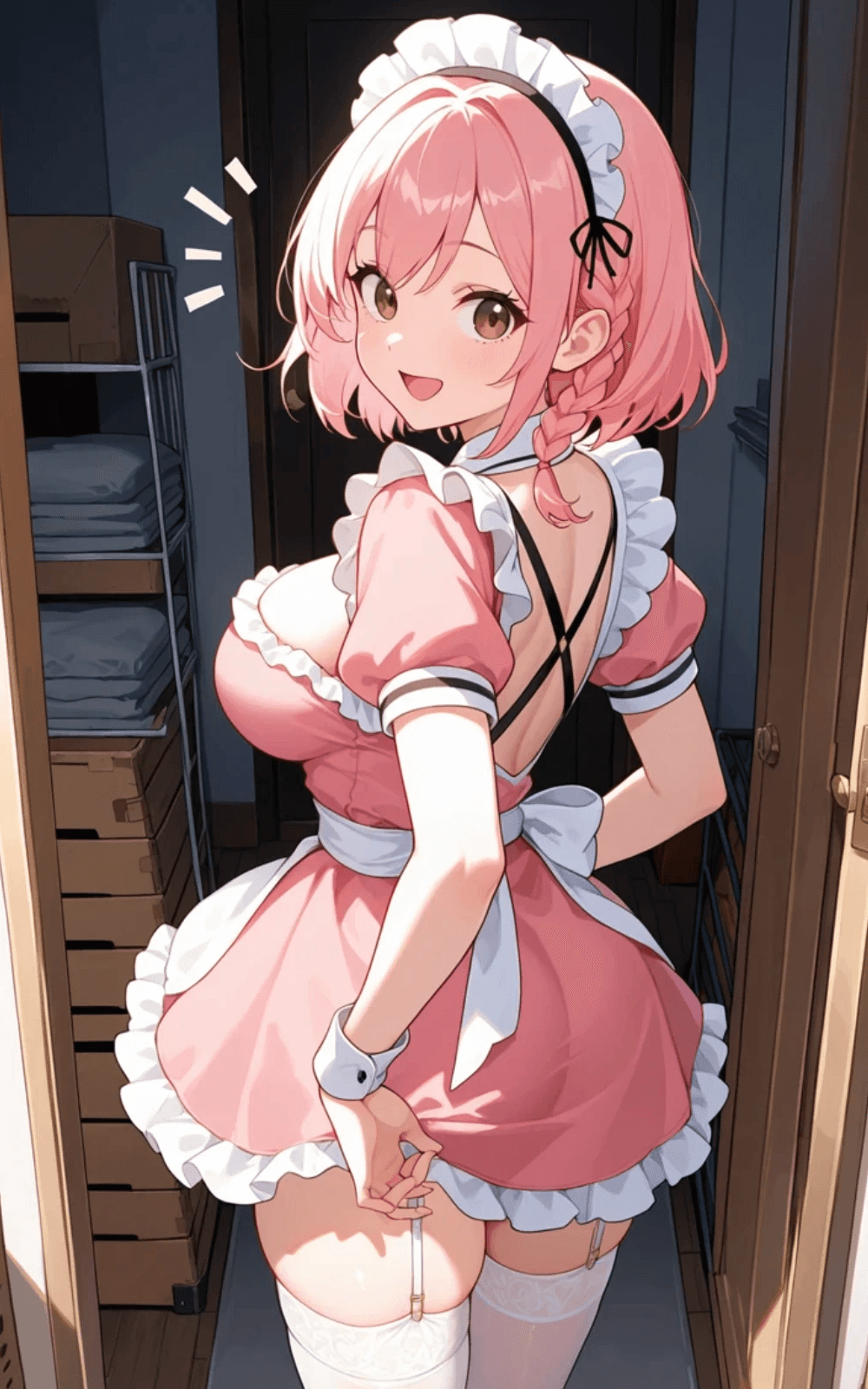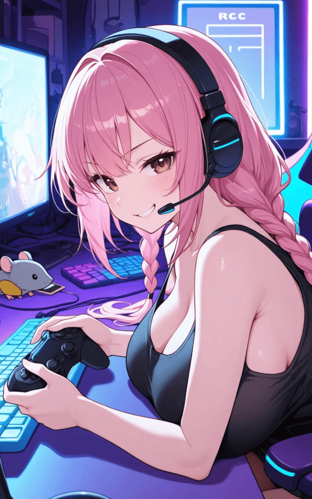 Rika Sato — a gamer girl with pastel pink hair, who games at night and works in a maid café by day. Playful, teasing, kawaii-cute but bold when the moment’s right.